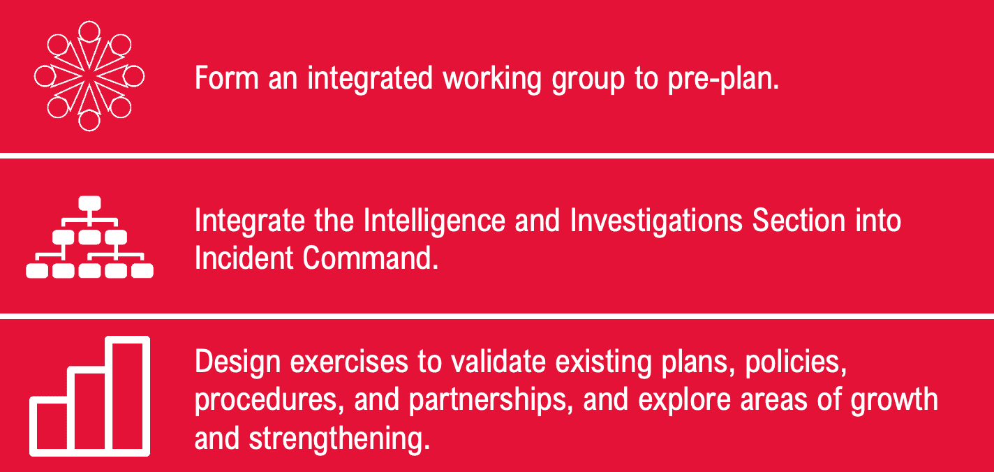 Form an integrated working group to pre-plan. One of the best and first steps of preparedness is to know who you will be working with before a critical incident occurs. The next step is to collaborate with one another to ensure that if a critical incident does occur, pertinent stakeholders know how they will integrate with one another to provide an effective response. Integrated working groups, like the one described, can follow in the footsteps of working groups for pre-planned mass events such as festivals and sporting events.