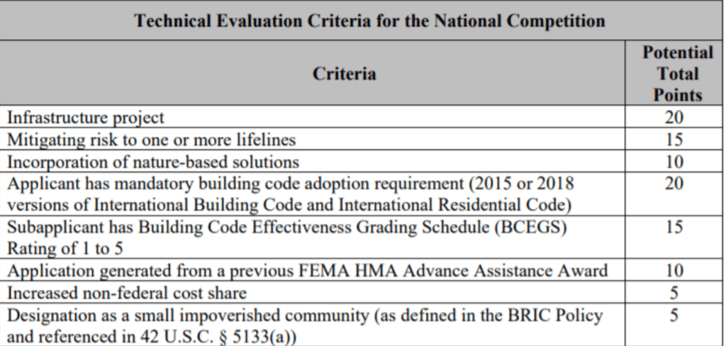 The technical criteria identified in the BRIC NOFO further solidifies the program’s prioritization of public infrastructure projects and focus on bolstering community lifelines – systems that enable continuous operation of critical government and business functions within a community. A project that addresses infrastructure and mitigates risk to one or more community lifelines may earn up to 35 points of 100 points enumerated under the Technical Evaluation Criteria for the National Competition.